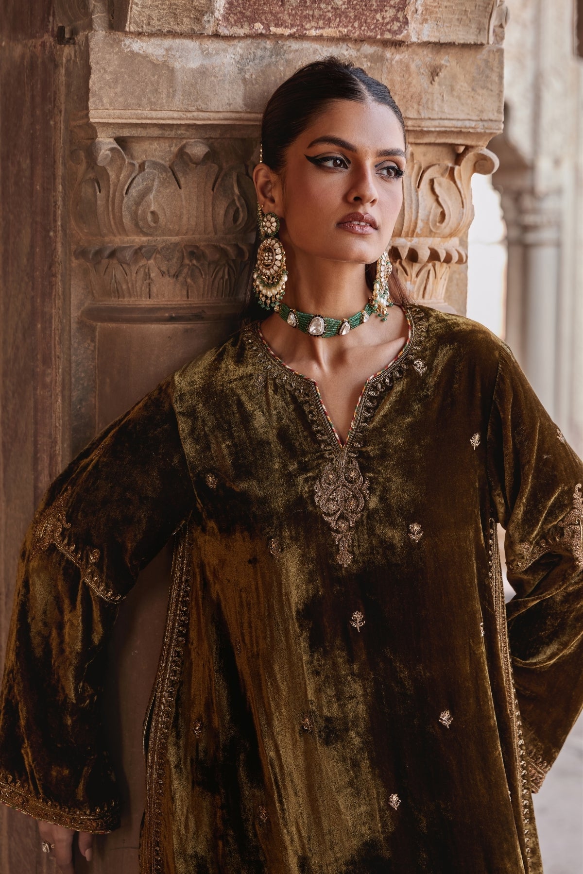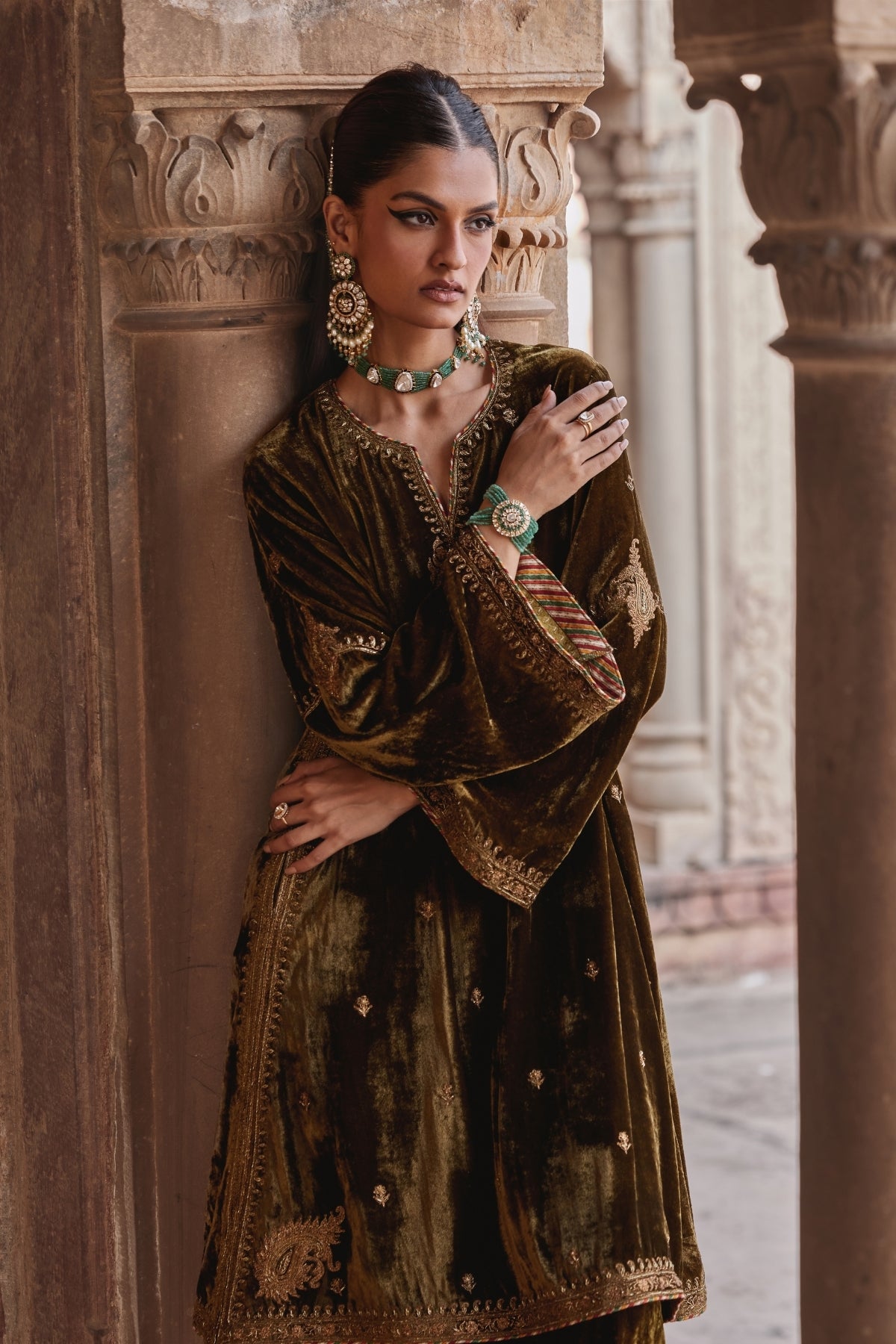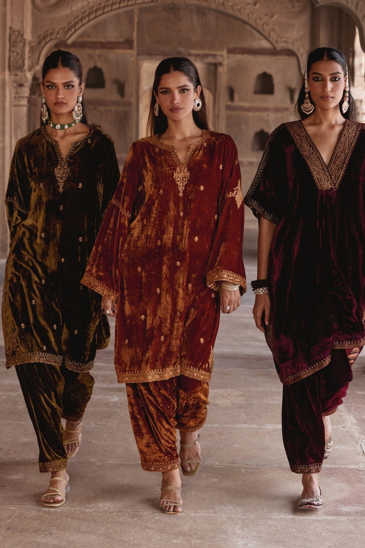 Featuring a Kaftan Set in solf silk Velvet with a Relaxed And Chic Silhouette.Made in hand embroidered with zari and sequine on V shaped Neckline , bell sleeves with small motifs all over . It Is Styled With A Pair of same cordinated bottom.Perfect for your winter glam look.