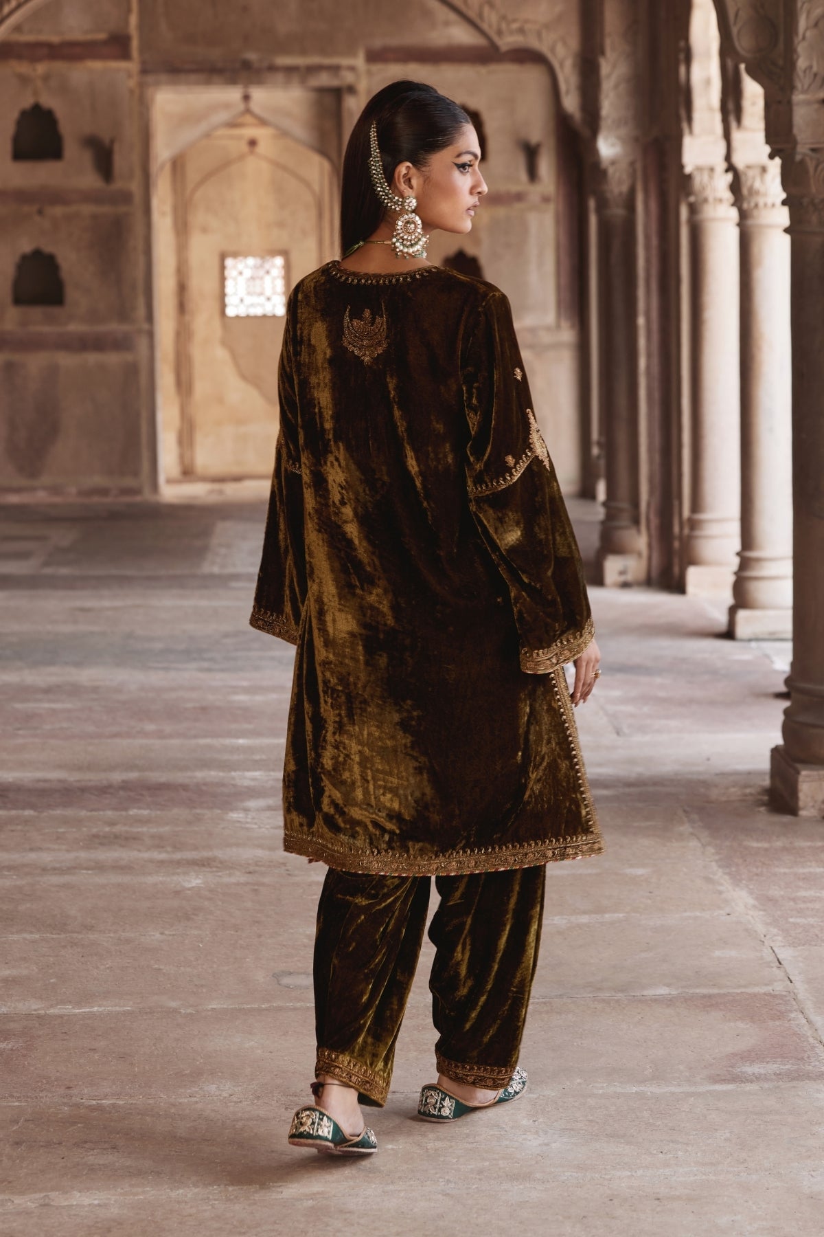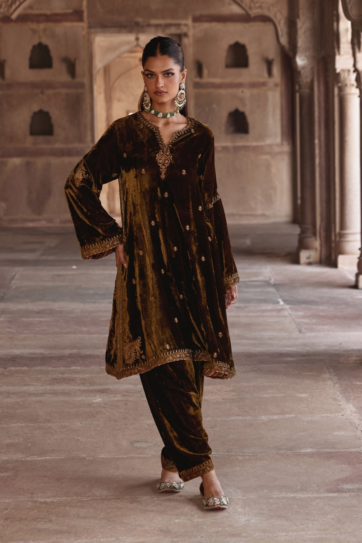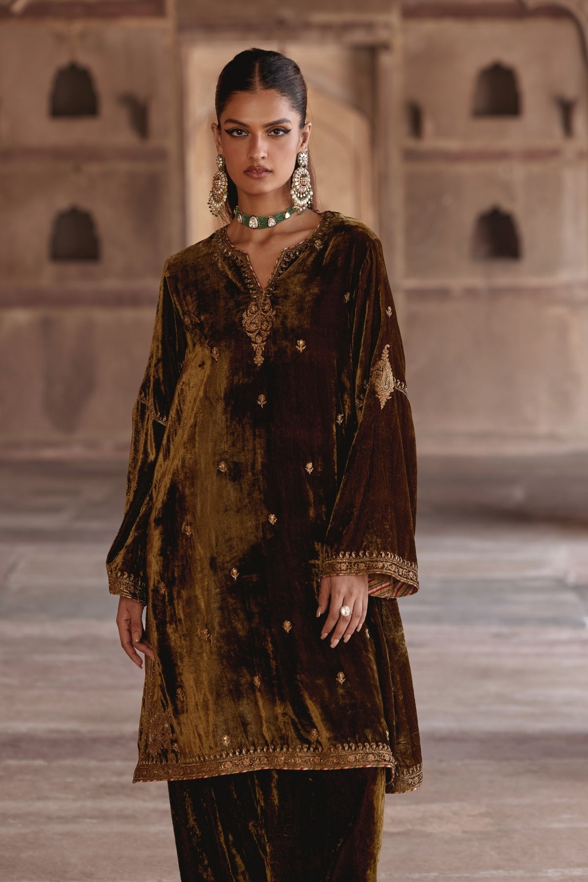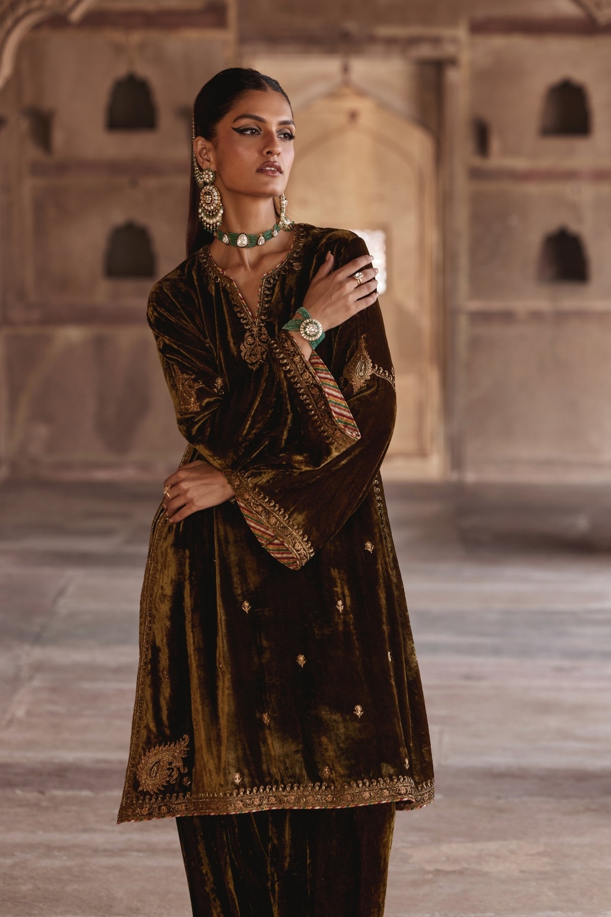 Featuring a Kaftan Set in solf silk Velvet with a Relaxed And Chic Silhouette.Made in hand embroidered with zari and sequine on V shaped Neckline , bell sleeves with small motifs all over . It Is Styled With A Pair of same cordinated bottom.Perfect for your winter glam look.